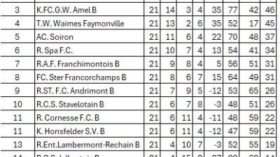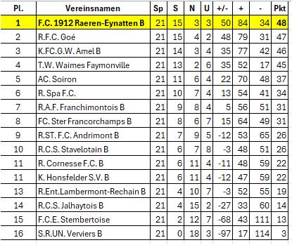 Durch den Sieg unserer Jungs in Verviers und die Niederlage des bisherigen Spitzenreiters T.W. Waimes-Faymonville gegen Goé sind unsere Jungs SPITZENREITER der P4 F – punktegleich mit TWWF – aber mit einem Sieg mehr!!! 💪🏻💪🏻👏🏼👏🏼👍🏼