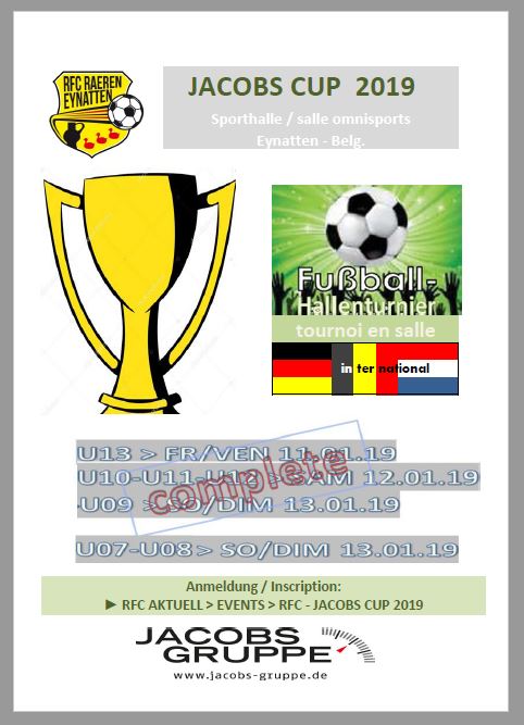 Full house – notre tournoi RFC JACOBS CUP 2019 est complet:  72 équipes venant de la Région Germanophone, de la Wallonie, de l’Allemagne et des Pays-Bas sont inscrites. Rien ne va plus dans les catégories U13 le vendredi soir, les U10, U11 et U12 le samedi, ainsi que les U7, U8 et U9 le dimanche